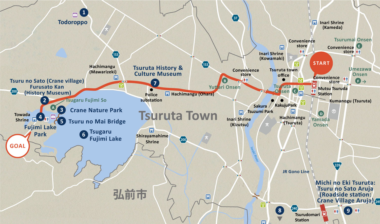 *There is no bus transportation to Tsuru-no-Mai Bridge, Tsugaru Fujimi Lake, and Fujimi Lake Park. Only taxis are available as public transportations.